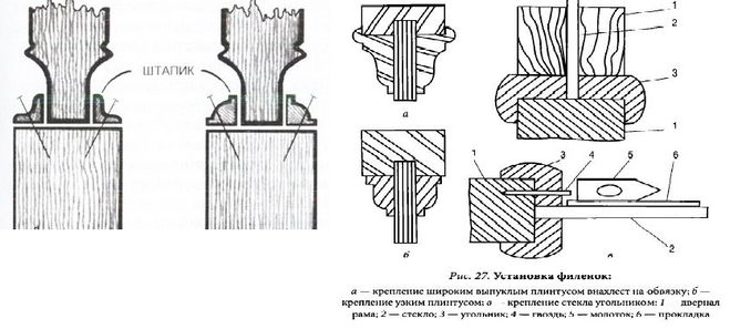 Подготовленный штапик распиливается в размер при помощи углопильного устройства - стусла. После примерочной раскладки по четвертям, прочно и аккуратно прибивается гвоздями без шляпок либо специальными шпильками к основанию рамы (двери). При этом прижимая филенку в месте фиксации максимально плотно.